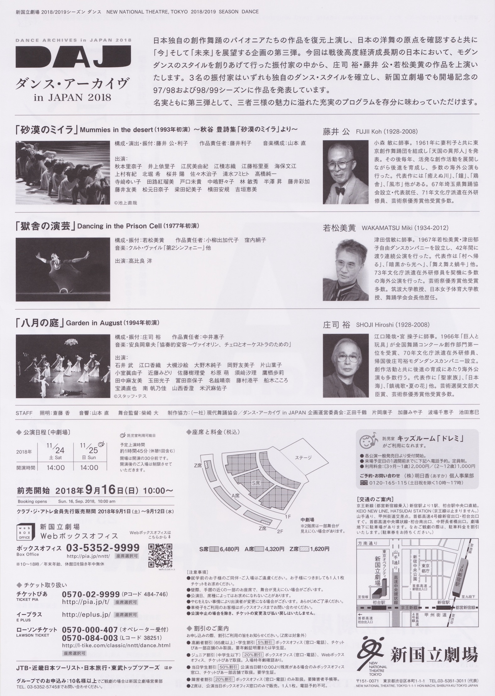 日本独自の創作舞踊のパイオニアたちの作品を復元上演し、日本の洋舞の原点を確認すると共に「今」そして「未来」を展望する企画の第三弾。今回は戦後高度経済成長期の日本において、モダンダンスのスタイルを創りあげて行った振付家の中から、庄司裕・藤井 公・若松美黄の作品を上演いたします。